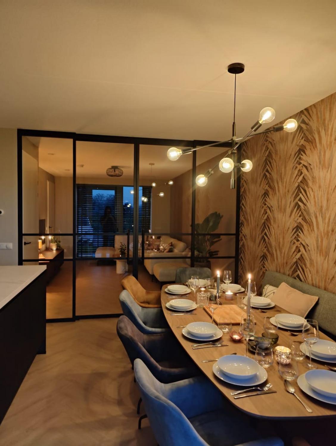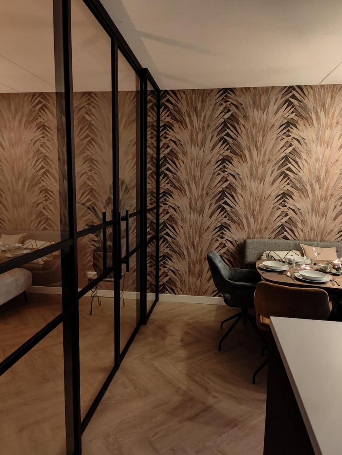 Voor dit interieur leverden wij steellook schuifdeuren. Een prachtige keuze waarmee veel ruimte wordt gewonnen. Geen openslaande deuren, maar panelen die efficiënt naar de zijkant worden geschoven. Aan weerszijden van de schuifdeuren bevinden zich vaste wanden in exact dezelfde stijl die de steellookwand compleet maken.